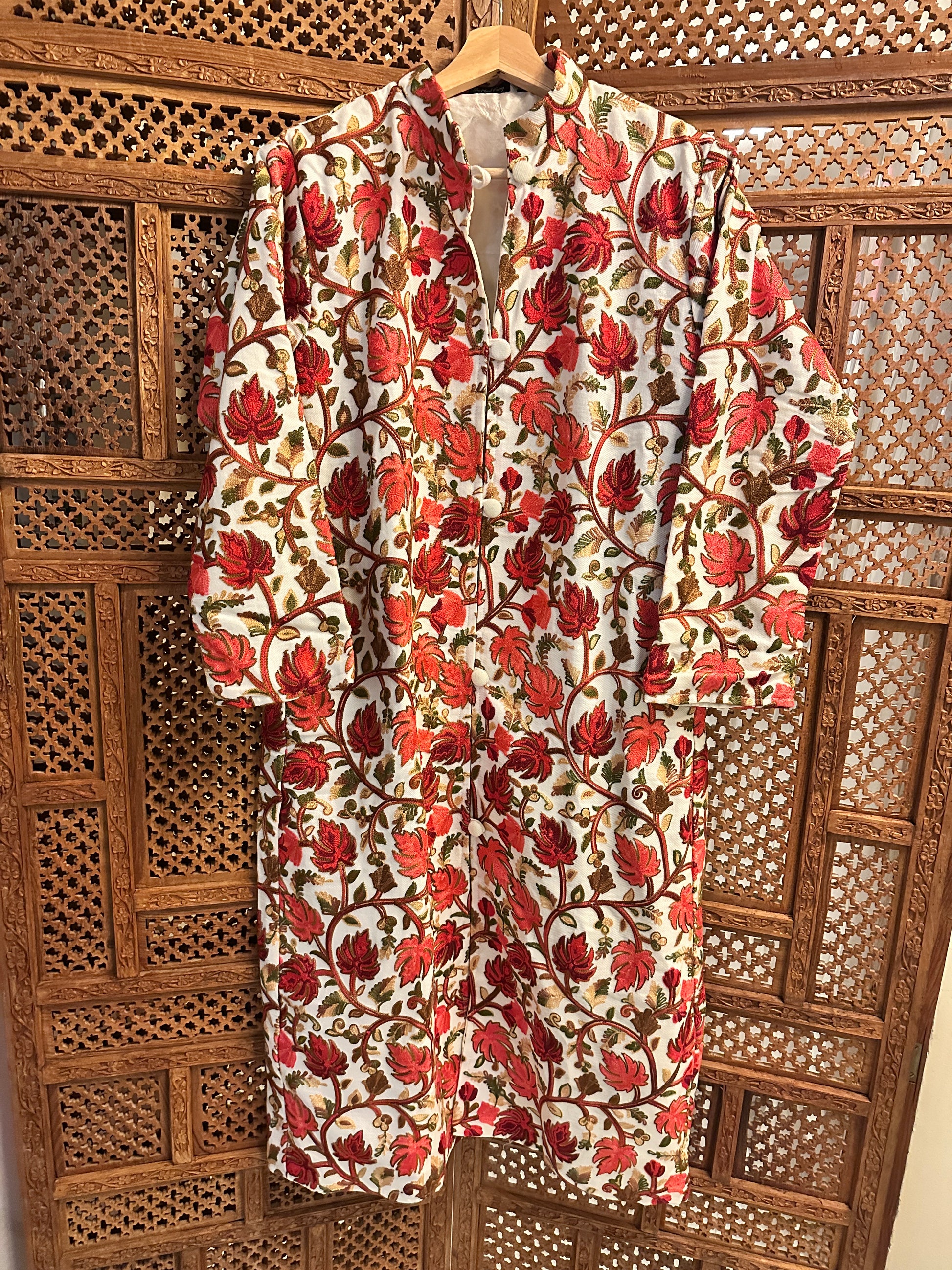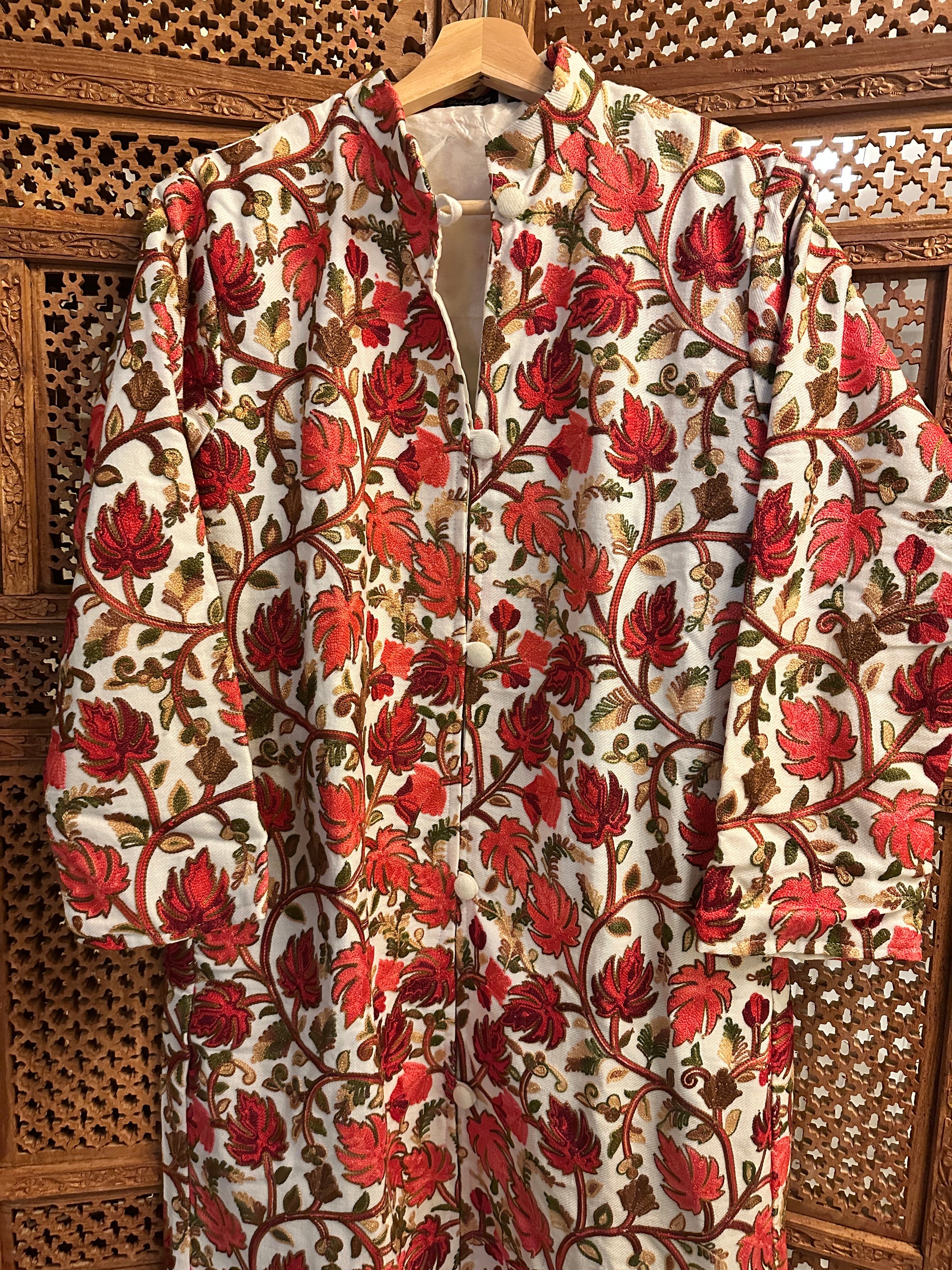 Experience the ultimate in warmth and style with our exquisite Pashmina Coat. Crafted from the finest pashmina wool, this luxurious coat offers unparalleled comfort and elegance. Its intricate embroidery and delicate detailing showcase the rich heritage of Kashmir. Perfect for those chilly winter days, this coat is a timeless piece that will elevate your wardrobe. Embrace the beauty of Kashmir with every drape. Worn over your clothes, it's the perfect addition to your winter wardrobe.