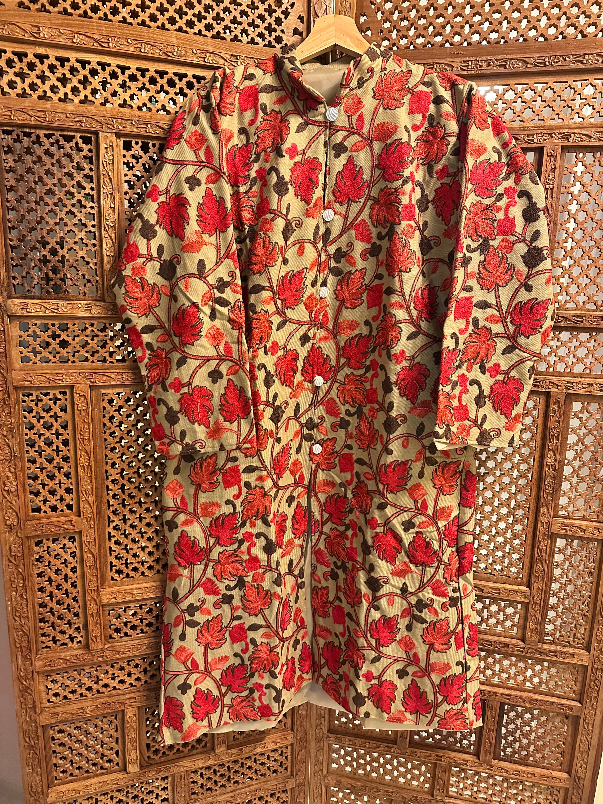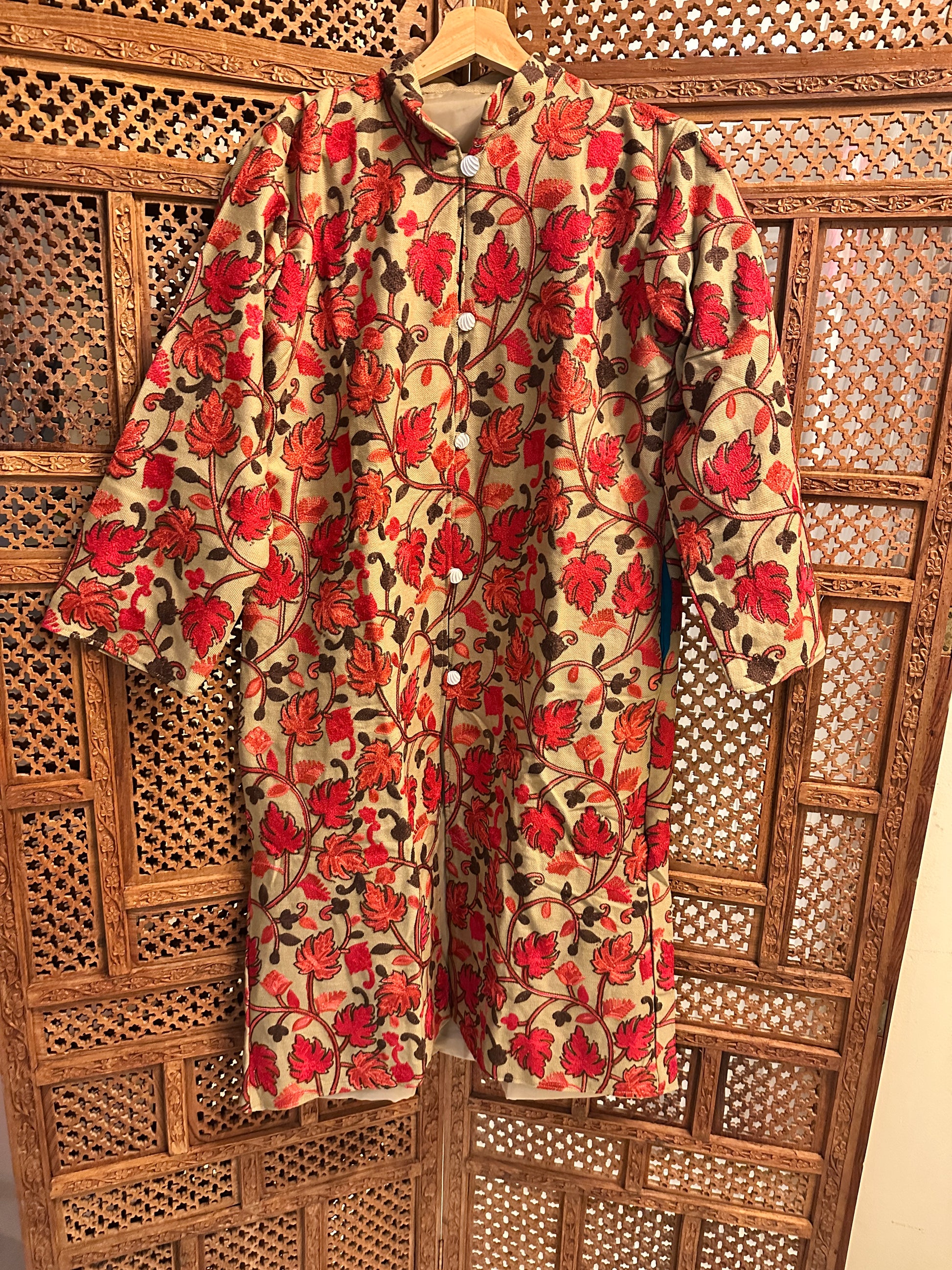 Experience the ultimate in warmth and style with our exquisite Pashmina Coat. Crafted from the finest pashmina wool, this luxurious coat offers unparalleled comfort and elegance. Its intricate embroidery and delicate detailing showcase the rich heritage of Kashmir. Perfect for those chilly winter days, this coat is a timeless piece that will elevate your wardrobe. Embrace the beauty of Kashmir with every drape. Worn over your clothes, it's the perfect addition to your winter wardrobe.