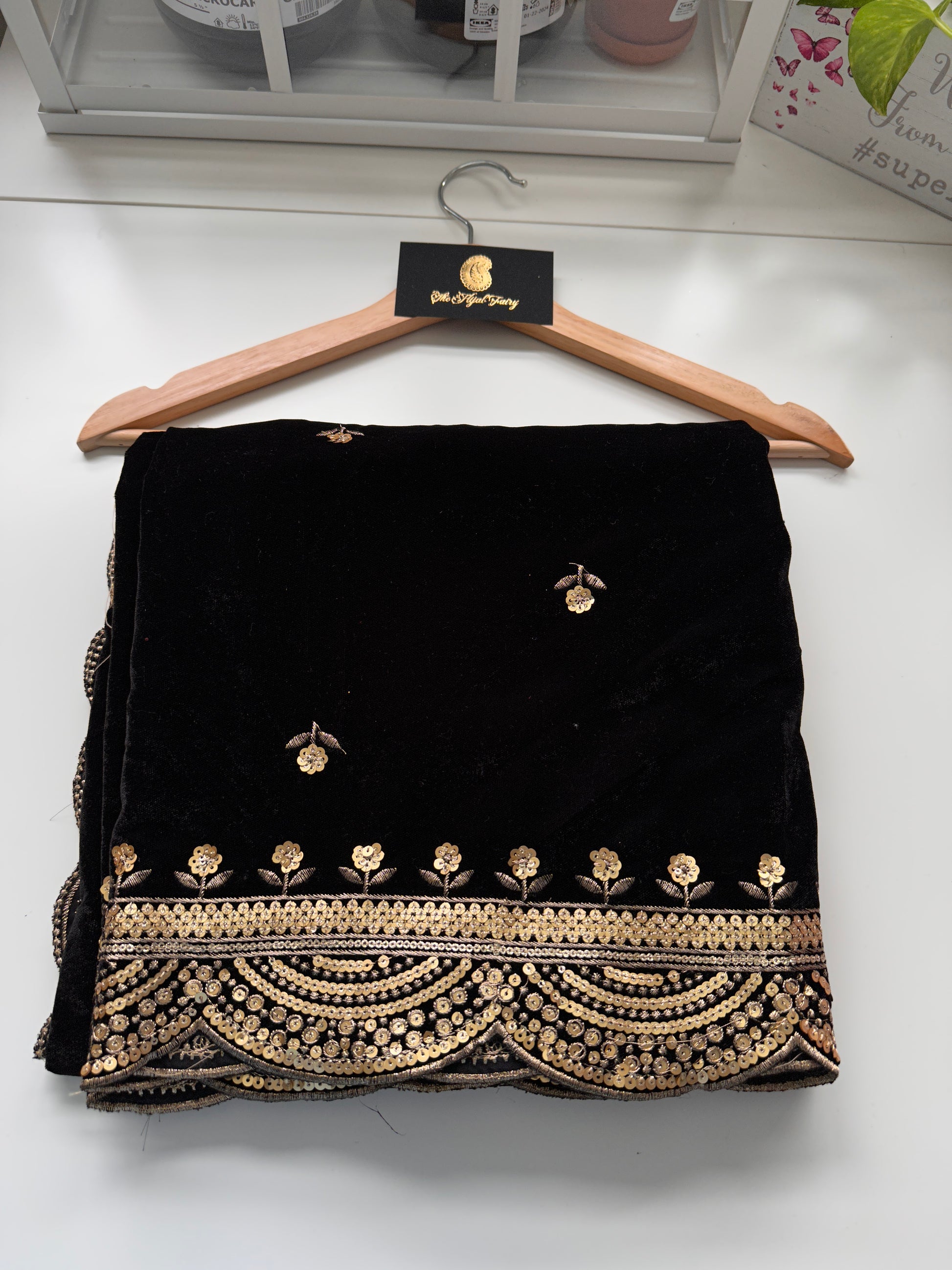 Enhance your style effortlessly with our luxurious Velvet Shawl, a versatile accessory crafted from sumptuously soft black velvet measuring approximately 0.8 meters by 2.5 meters. Whether draped elegantly for formal occasions or casually layered for daytime chic, this timeless piece adds opulence to any outfit, seamlessly blending comfort and style.