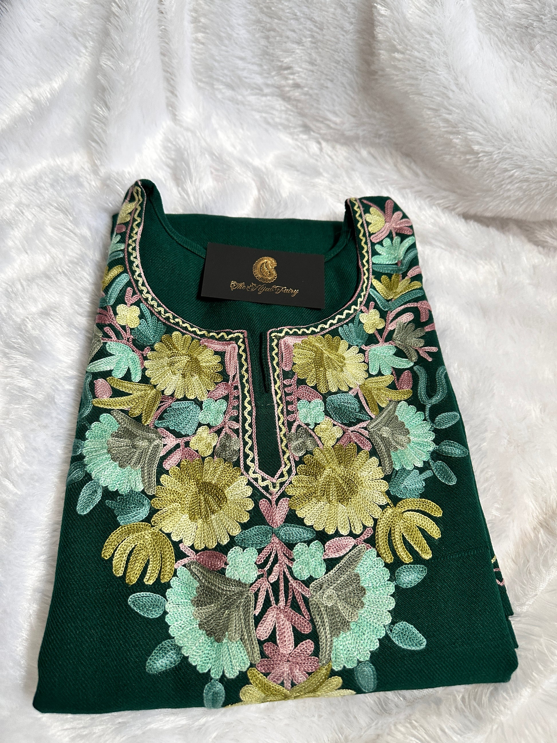 Experience the epitome of Kashmiri craftsmanship with our exquisite Pashmina Pheran. This luxurious garment offers unparalleled warmth and comfort. Its intricate embroidery and delicate detailing showcase the rich heritage of Kashmir. Perfect for special occasions or everyday wear, this Pheran is a timeless piece that will elevate your wardrobe. Embrace the beauty of Kashmir with every drape. Worn over your clothes, it's the perfect addition to your winter wardrobe.