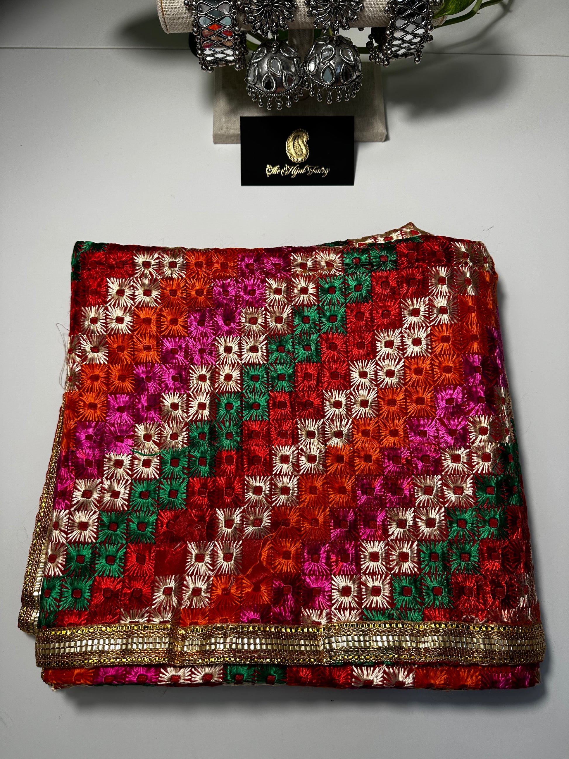 Experience the exquisite allure of tradition with our Phulkari Bagh Dupatta, adorned with shimmering mirrors that capture the spirit of a vibrant culture. Handcrafted with precision, this dupatta beautifully showcases the intricate Phulkari embroidery, symbolizing the rich heritage of Punjab. The delicate mirror work adds a touch of opulence, making it the ideal accessory for weddings, and celebrations, or to infuse everyday wear with a touch of ethnic charm. Draped with grace, this Phulkari Bagh Dupatta is a fusion of timeless tradition and contemporary style, ensuring that every fold resonates with the artistry of India and adds a radiant sparkle to your ensemble. Evoke the essence of Punjab with this enchanting and versatile accessory.